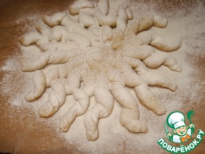 Сформированное солнышко присыпьте мукой и поставьте подходить в теплое место минут на 30.