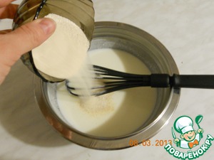 Добавить яйца, всыпать муку, перемешать. Оставить на столе на 30 мин.