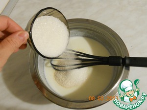 Всыпать в йогурт манную крупу, соль и сахар, перемешать.