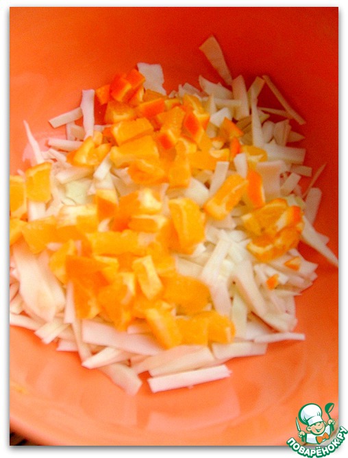 Очищаем и маленькими кубиками нарезаем апельсин...