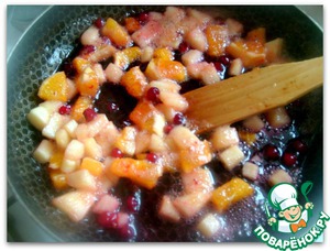 Тушим с сахаром яблоки и апельсин, нарезанные кубиками, с 1 горстью клюквы