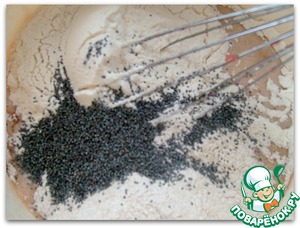 Добавляем оба вида муки, разрыхлитель и мак. Тщательно перемешиваем