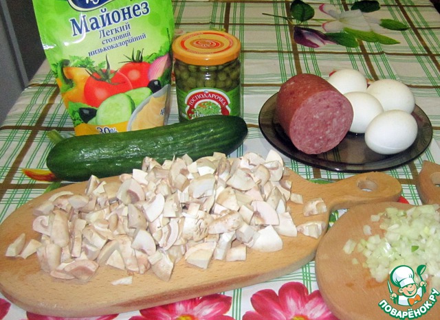 Грибы и лук режим и обжариваем на сковородке. Колбасу, огурец и вареные яйца нужно просто порезать.