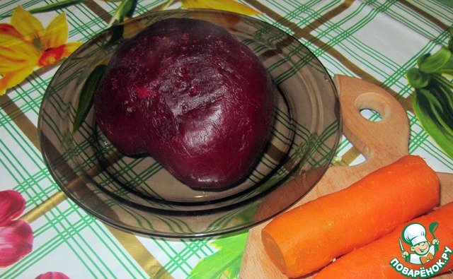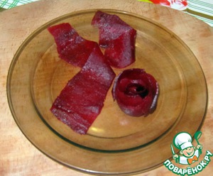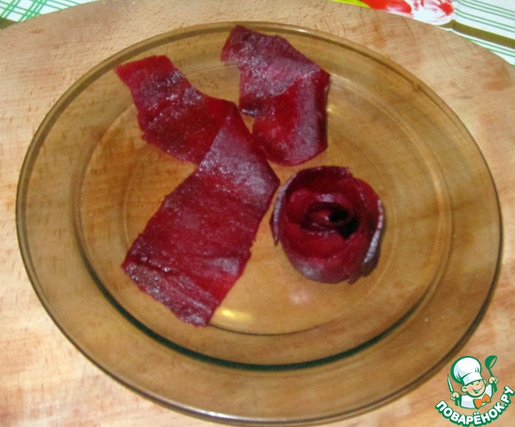 Отрезаем от свеклы тонкую широкую ленточку и формируем розочку, также поступим и с морковью.