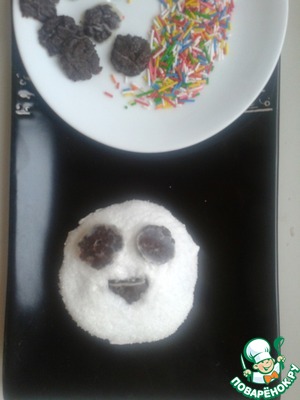 Из шоколадных точек делаем ушки, нос, основу для глаз.