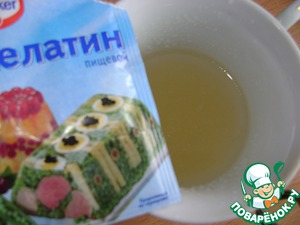 Желатин 10г залить 100 мл воды и оставить для набухания на 10 минут. Поставить желатин на маленький огонь, подогреть примерно до 60 градусов. Перемешать, желатин должен полностью раствориться. Остудить.