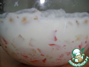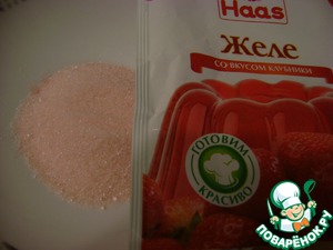 Для торта взяла два вида желе-со вкусом персика и клубники. Можно еще добавить киви, чтобы цвет торта был разнообразнее (у меня не было). Чтобы приготовить желе, надо вскипятить воду. В блюдо с желе влить 250 мл кипяченой горячей воды и тщательно перемешать до полного растворения.