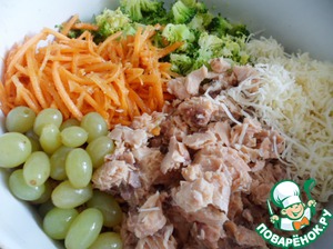А теперь все смешиваем:рыбу, брокколи, сыр, морковь и виноград. Виноград лучше брать помельче, чтоб не пришлось резать и обязательно сладенький. Он обалденно сочетается с остальными ингредиентами.