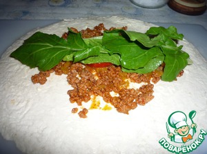 Добавляем пару листочков салата и рукколы. Аккуратно сворачиваем рулет.