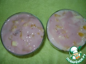 Добавляем йогурт по половине стаканчика в каждую креманку. Я использовала вишневый йогурт.