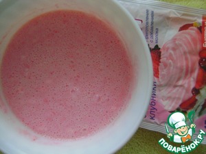 Теперь надо приготовить взбитые сливки со вкусом клубники. Содержимое пакетика надо высыпать в 150 мл охлажденного молока.