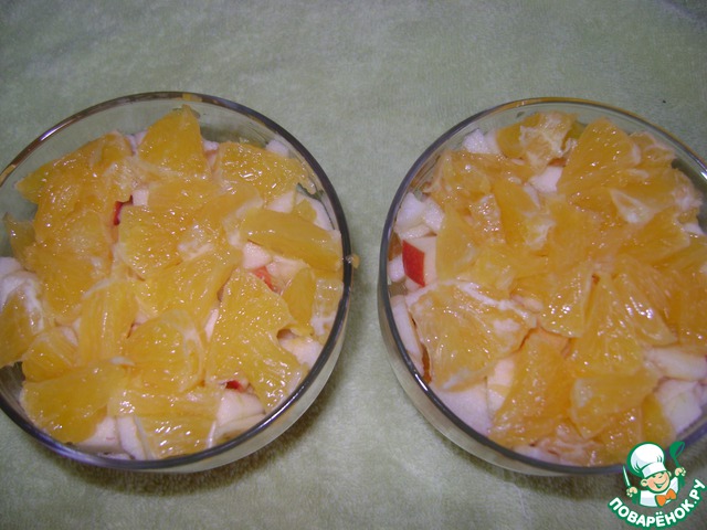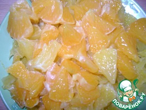 Апельсин и мандарин очищаем, нарезаем кусочками.