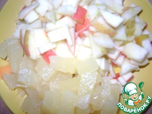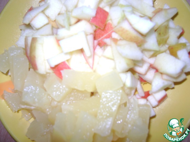 Половинку яблока и два кольца консервированного ананаса нарезаем на кубики.
