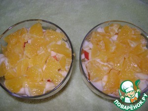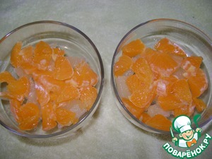 По креманкам раскладываем кусочки ананаса, мандарина.