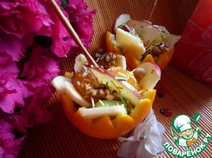 • Заполнить апельсиновую корзинку нарезанными фруктами, добавить грецких орехов. Сверху полить апельсиновым соком с медом, посыпать декоративным сахаром.