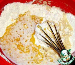 Готовый кекс граммов на 700. Или приготовить кекс из порошка. Порошок высыпать в ёмкость с водой и добавить растопленное масло.