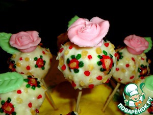 Рисовала, можно сказать, наспех и не очень всё гладко получилось. Шарики приготовила вечером и убрала в холодильник. На следующий вечер после работы собралась заняться раскрашиванием шариков. Старший сын увидел, что я открываю холодильник, и говорит, - "Какие вкусные беленькие штучки ты сделала..." Я, - " Какие штучки? Это мои конкурсные пирожные на шпажках." Сын - "Ну я же не знал..." Осталось из 20 - ти девять шариков. Настроение не ах, дрожащими руками налепила то, что вы тут сейчас видите. Цветочки и бабочки не стала вырисовывать, а поставила сверху готовые сахарные розочки и листочки... Пасха в этом году поздняя, появятся и цветочки, и бабочки!