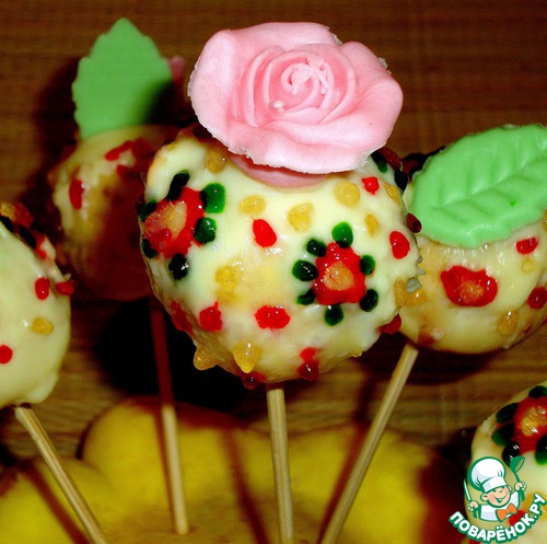 Растопить шоколад на водяной бане. Шпажками наколоть шарики и обмакнуть в шоколад. Перед тем, как будете обмакивать шарики в шоколаде, найдите приспособление, куда вставить шпажки с шариками. Можно в миску с крупой, сахаром...