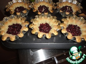 Включаем духовку на 180 гр. Раскатать тесто не больше 0,5 см. толщины. Выложить в формочки. Чтобы тесто не поднималось, застелите донышко бумагой и присыпьте сухой фасолью. Выпекать 20-25 мин. Вынуть из духовки и дать остыть в форме. Убрать фасоль.