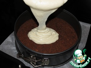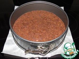 Масло растопить, соединить с крошкой из печенья, перемешать и выложить в разъемную форму. Разровнять и поставить на время в холодильник. -