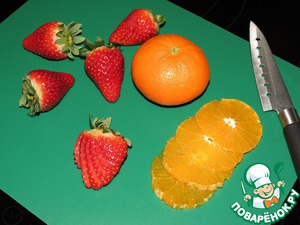 Клубнику надрезать до хвостика на несколько частей. Мандарин очистить и нарезать кружками.