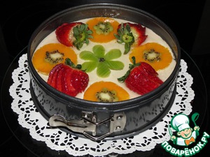 На какой поверхности разложить фрукты? На 4 шаге фрукты на какой-то зелёной поверхности, а на 5-м - уже на поверхности чизкейка. Видимо, из застывшего желе с фруктами надо вырезать круг по размеру чизкейка и уложить сверху на чизкейк, поверх крема из маскарпоне?