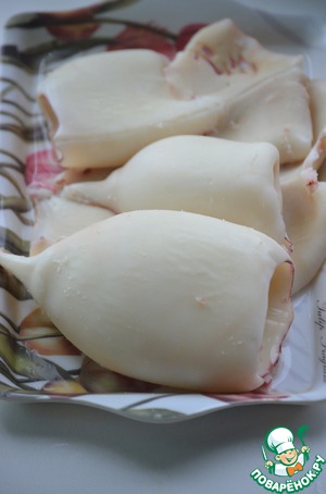 В подсоленную кипящую воду опустите подготовленное мясо. Варить кальмаров необходимо непродолжительное время на слабом огне. Считается достаточным 2-3 минуты. Можно проверить готовность мяса на глаз. Как только мясо побелеет, подержите его в кипящей воде еще секунд десять и готово. Если Вы переварите кальмара, то мясо будет жестким и "резиновым" на вкус.