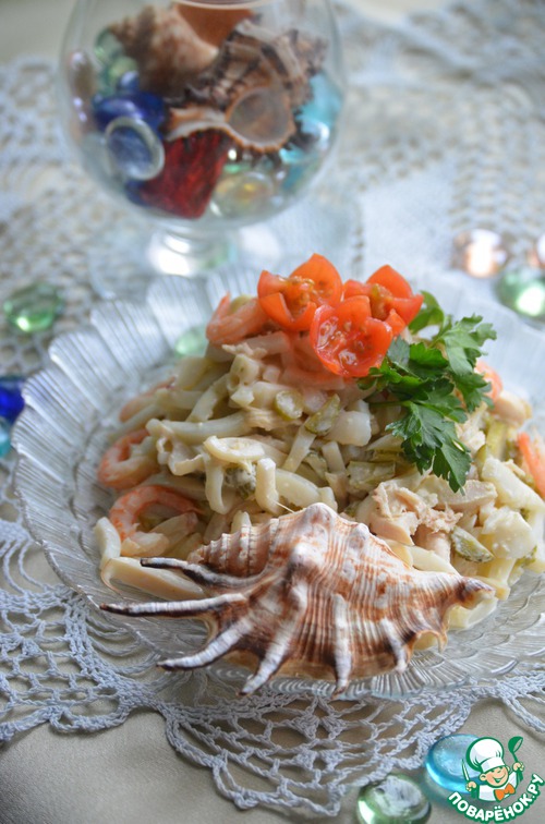 Нежный вкус куриного мяса, неподражаемый вкус кальмара-салатик запомнится на долго!