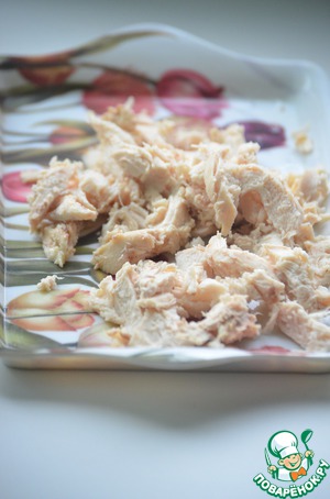 Куриное филе, отварить и измельчить, маринованный огурец нарезать кружочками.