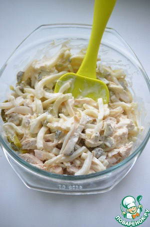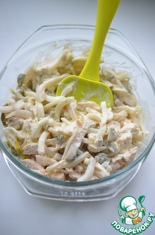 Куриное филе, кальмар, маринованный огурец соединить и заправить майонезом.