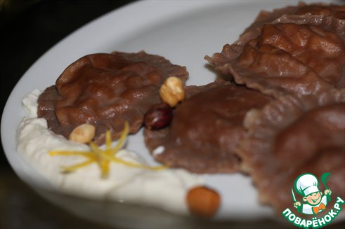 • Шоколадное тесто тонко раскатать и слепить равиоли любой формы. У меня сегодня кружочки))). Отварить равиоли в подсоленной воде до готовности.