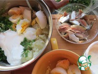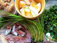 Сварить яйца и нарезать крупными кусками, кильку почистить и разделить на два филе, мельчить ничего не надо. Готовим в деревенском стиле. Зелень тоже нарезать довольно крупно.