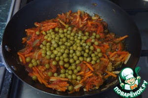 Затем добавить зеленый горошек, хорошо прогреть и снять с огня.