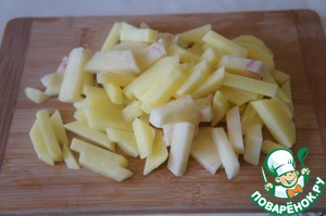 В кастрюлю налить воду, всыпать нарезанный брусочками картофель, довести до кипения и варить на слабом огне до полуготовности.