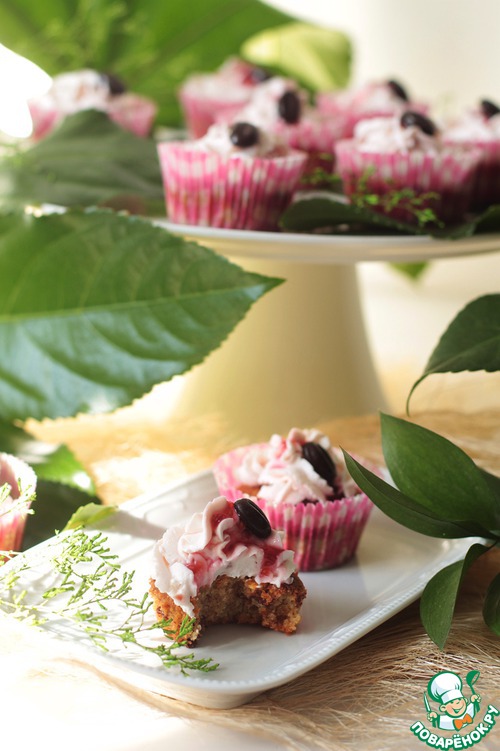 Охлажденные кексы выложить на форму, сверху положить творожный крем, немного джема и украсить по вашему вкусу.