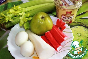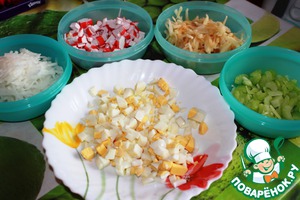 Крабовые полочки и яйцо нарезаем кубиками. Сельдерей тоненько шинкуем. Дайкон и яблоко трем на крупную терку.