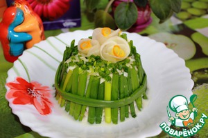 Зеленым луком закрываем все стороны салата и скрепляем заборчик тоже зеленым луком.