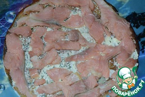 Выложить на плоское блюдо 1 блин. Промазать его по всей поверхности зеленым маслом, сверху положить кусочки горбуши.