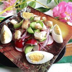 Подавать выложив на тарелку овощи, положив сверху перепелиные яйца и крутоны. Для более наглядного фото я не стала сразу добавлять соус, а подала его отдельно.