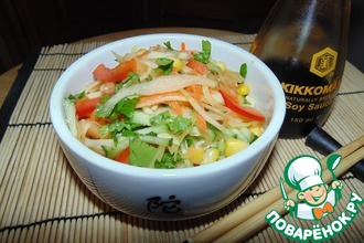 В миске смешать все овощи. Соус можно добавить сразу или подавать отдельно.