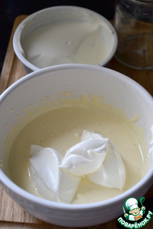 Отдельно взбить белки в крепкую пену. Для этого можно добавить щепотку соли. Очень аккуратно ввести лопаточкой к основной массе. Размешать.