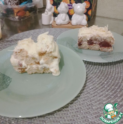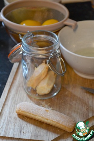 Печенье обмакнуть в сиропе и уложить в форму. -