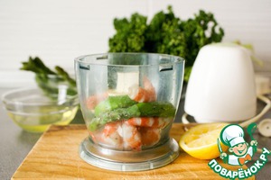 Очищенные креветки, пару стеблей спаржи, сок половинки лимона и яичный белок взбить вместе с помощью блендера.