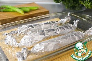Каждый получившийся рулет плотно укатать в фольгу (можно с помощью циновки). Хвостики фольги завернуть "конфеткой". Оправить в разогретую до 200 градусов духовку на 7-12 минут. После готовности, при разворачивании фольги, образовавшийся сок слить в отдельную емкость.