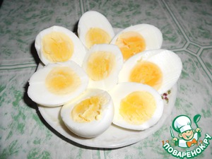 Варим яйца вкрутую, очищаем и разрезаем пополам.
