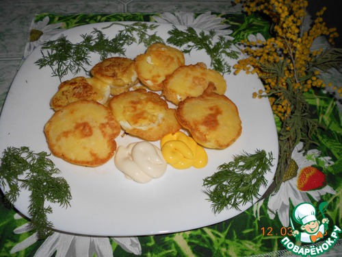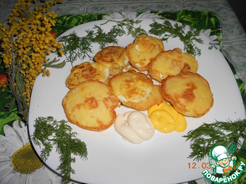 Половинки яиц обмакиваем в этот кляр и обжариваем на масле с обеих сторон до румянца. В оригинале рекомендовалось подавать эту закуску с обжаренными на масле веточками зелени петрушки, но я просто украсила зеленью блюдо :) "Украшатель" из меня пока только начинающий, но "Поварёнок" мотивирует и этому учиться! Приятного аппетита!