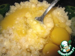 Всыпаем муку с разрыхлителем и соль, перемешиваем. Добавляем бананы и специи, перемешиваем.
