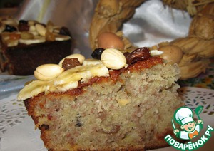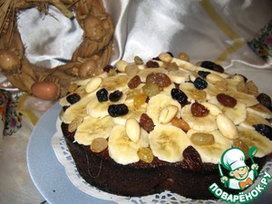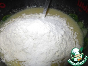 Форму смазываем маслом, посыпаем мукой и вливаем тесто. Выпекаем 45 минут. Украшаем пирог