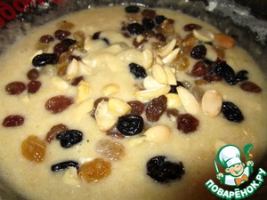Добавляем промытый изюм, очищенный миндаль и вновь перемешиваем.