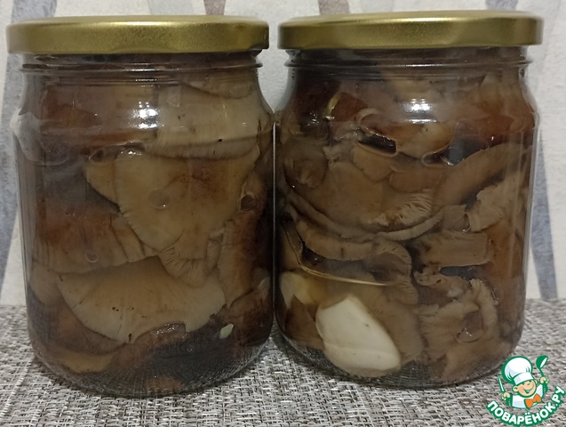 Горячие грибы раскладываю в стерильные банки, сверху заливаю прокипяченным растительным маслом и закатываю железными крышками.